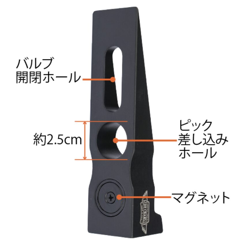 また、約2.5cmのピック差し込みホールと、バルブ開閉⽤の細⻑いホールを備えています。